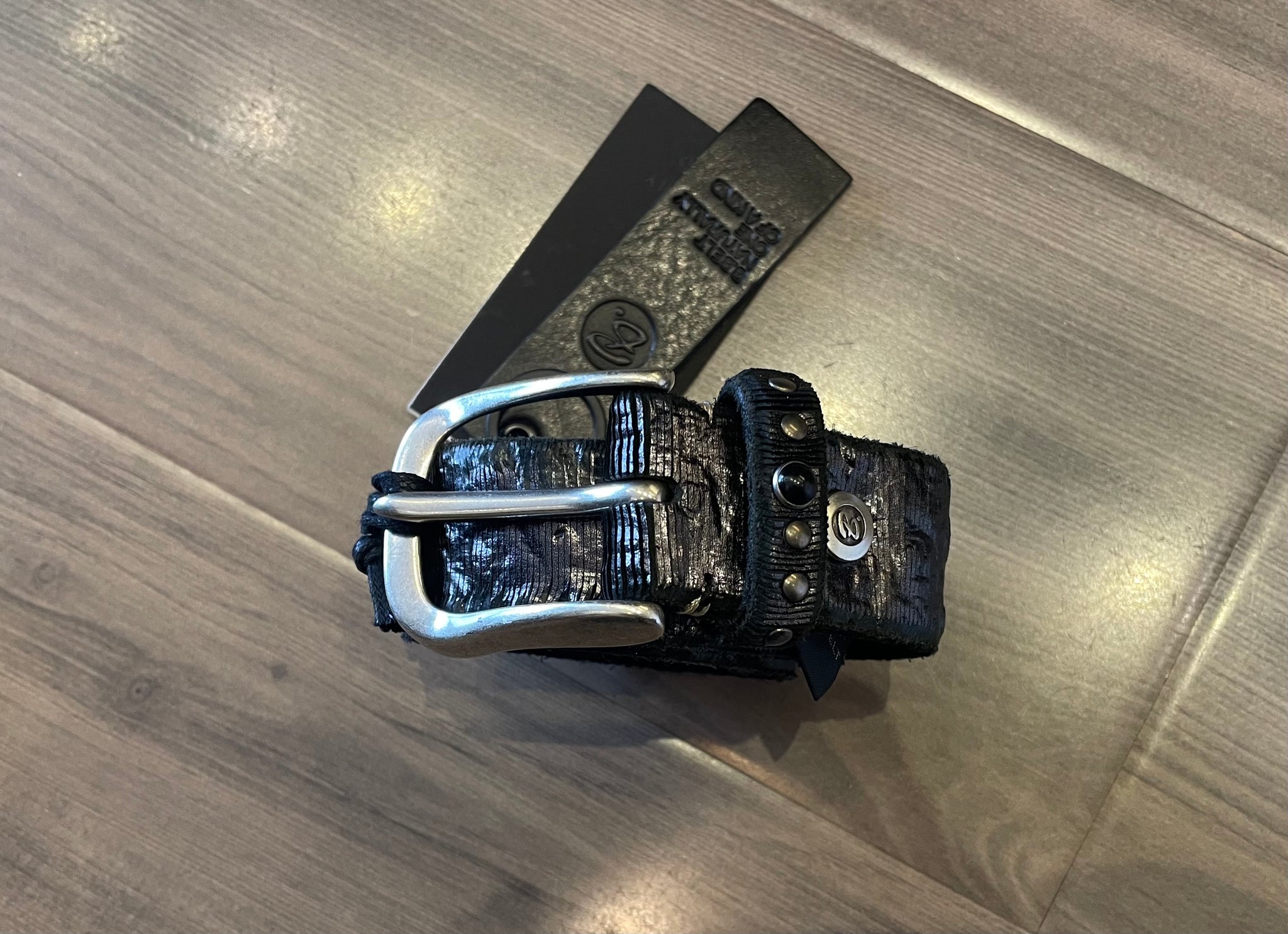 This black leather belt with a rustic shine has a rectangular pewter buckle. It is perfect for any occasion. Dress it up for a night out or wear it casual with jeans. A great addition to your wardrobe!