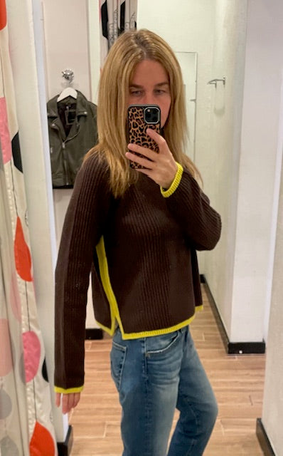 The latest sweater from J. Society is a cozy shaker stitch in a shadow grey and a bright orange trim. This playful yet sophisticated sweater will be great for this season and forward!
