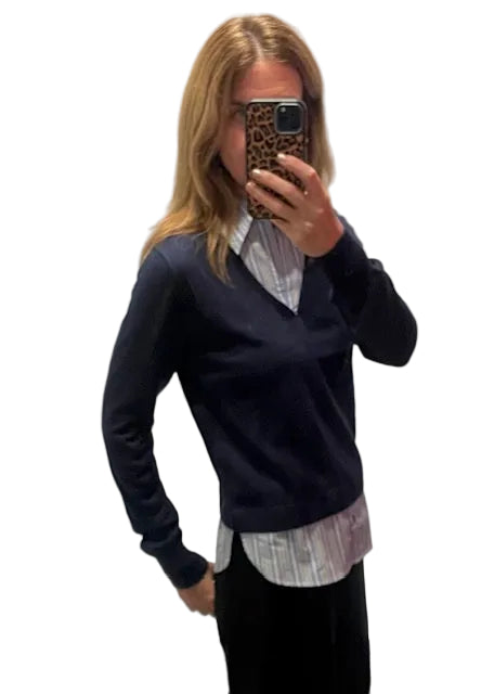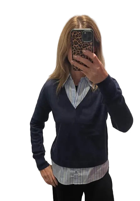 Layer up without the fuss! This clever twofer combines a cozy navy cotton V-neck sweater with a striped shirt underneath, giving you two looks in one. Perfect for those days when you want effortless style-just slip it on and you're ready to go. The soft cotton keeps you comfortable all day long, while the contrasting stripe adds a fun pop of personality. One piece, endless outfit possibilities.
