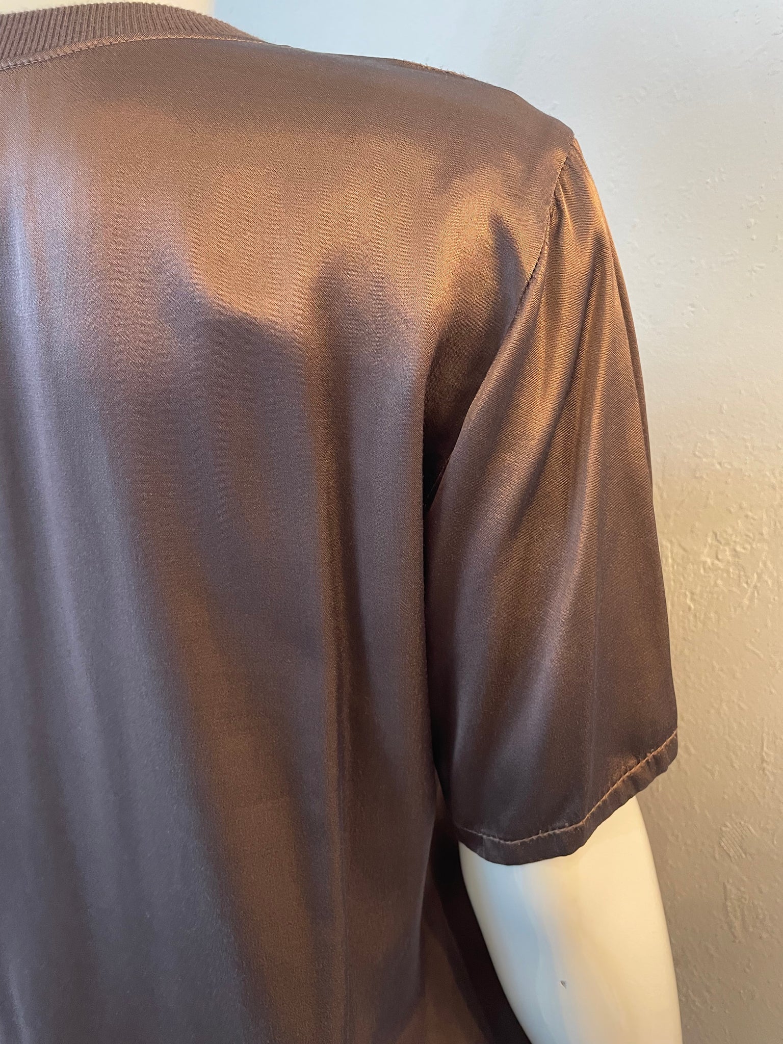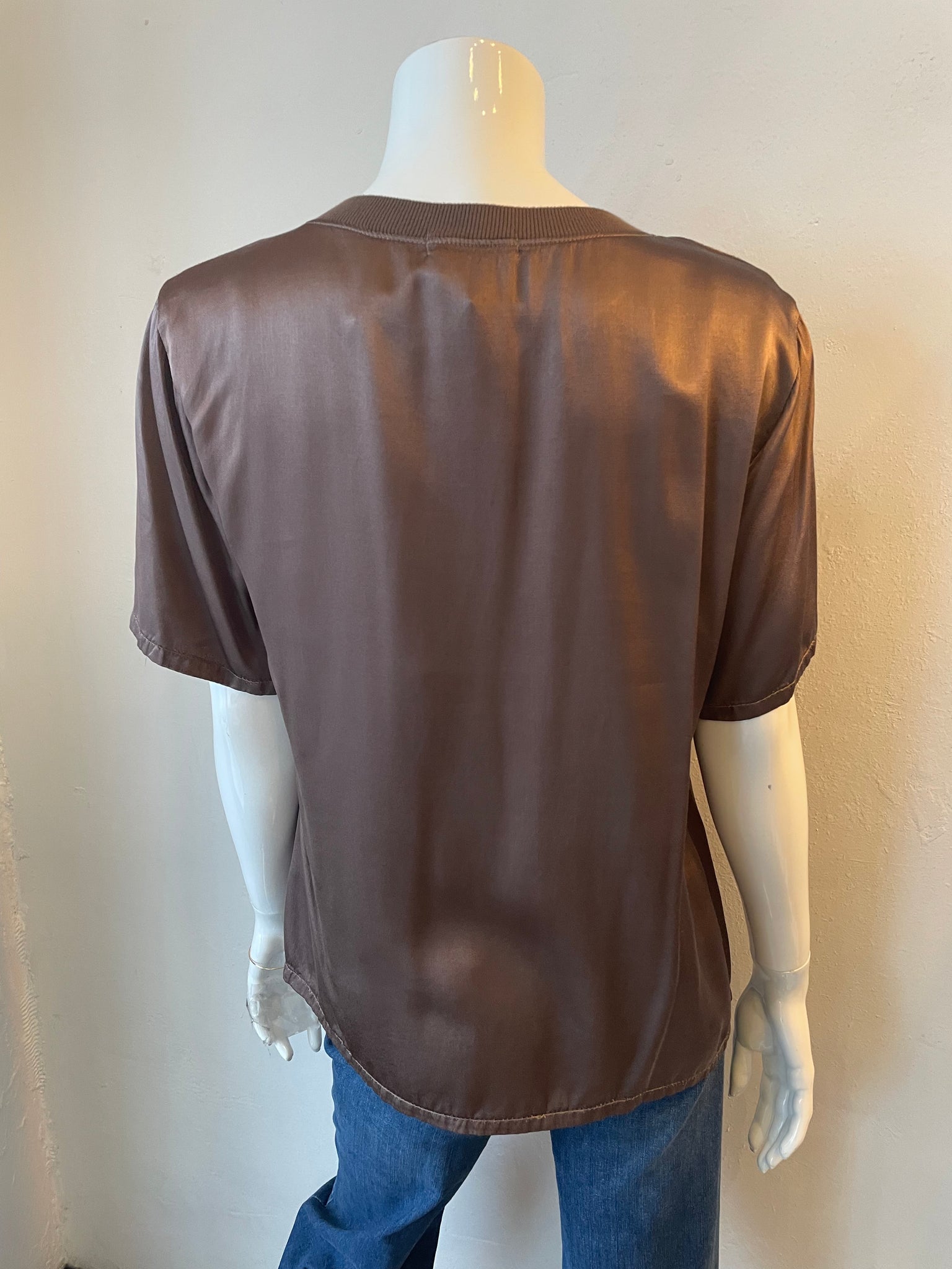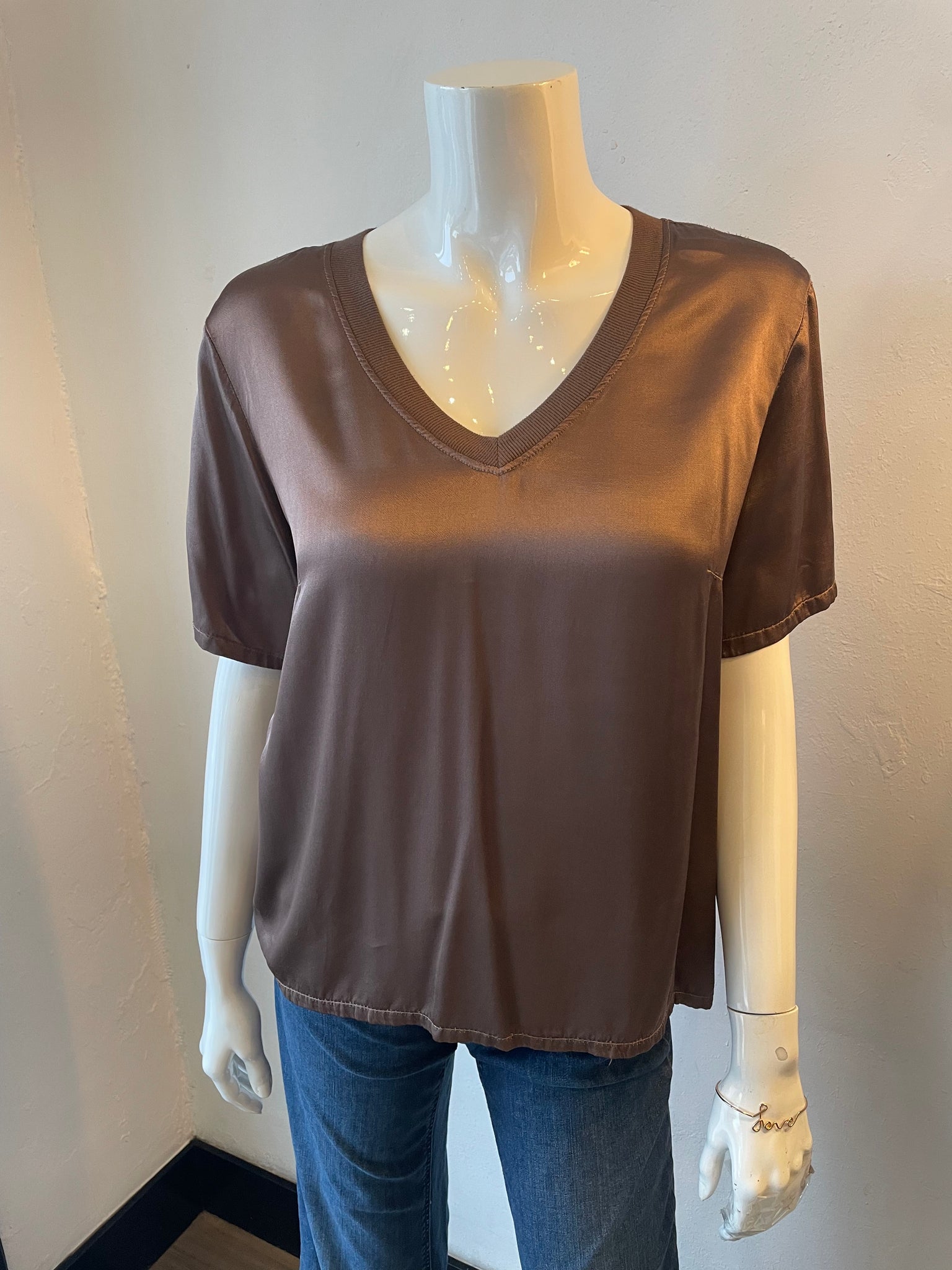 Effortless elegance meets everyday comfort in this silky short-sleeve V-neck. The ribbed neckline adds a polished touch that transitions seamlessly from casual days to night-out moments. Crafted in a luxe fabric with a flattering cut, it's the versatile piece your wardrobe's been waiting for. Dress it down with jeans or elevate it for dinner-this LA-made essential does it all.