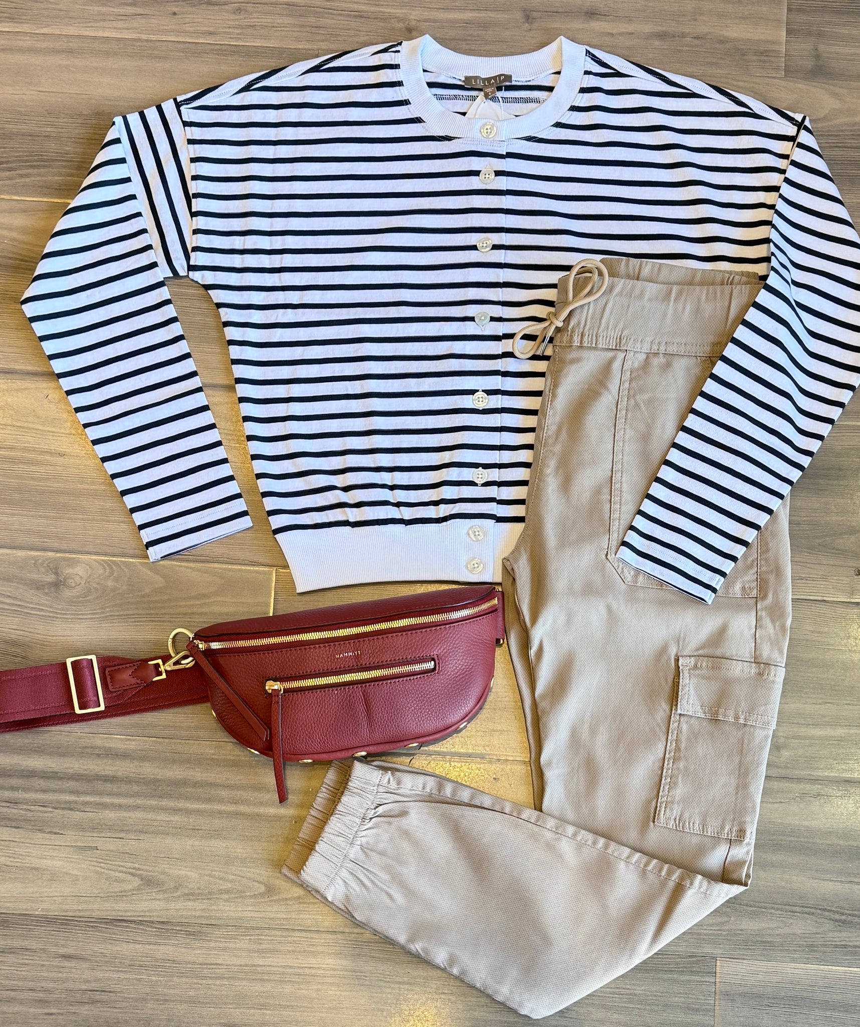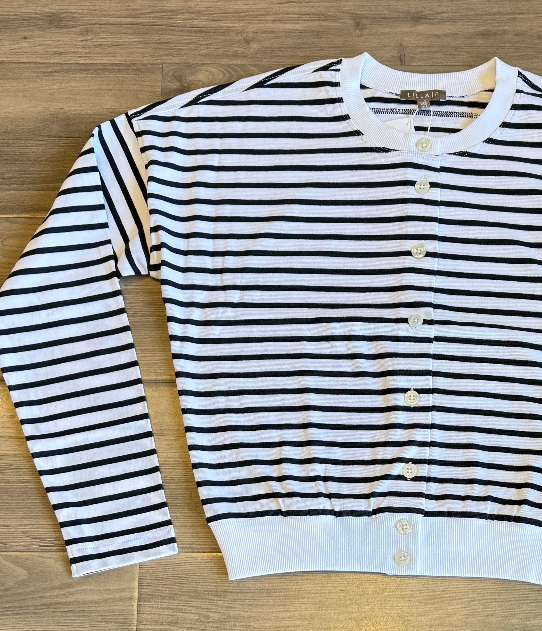 Ahoy, style lover! This navy and white striped cardigan is your ticket to effortless nautical charm. With its crisp stripes and refined rib trim, it's the perfect layer for channeling that breezy seaside aesthetic-whether you're actually by the ocean or just dreaming of it. Throw it over a sundress, pair it with white jeans, or wear it solo for instant coastal cool. A playful wardrobe essential that makes every day feel like a mini vacation.