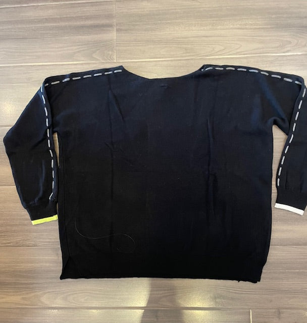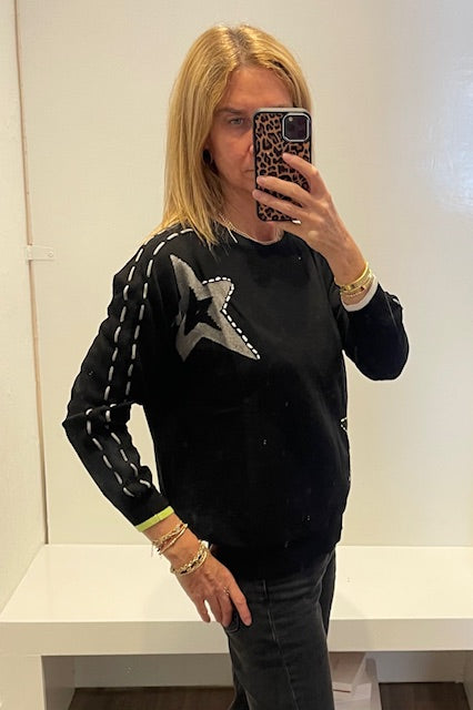Black cotton cashmere sweater features charcoal grey stars with lime green & white whipstitch detail & cuffs. The perfect amount of whimsy to brighten up your sweater collection!