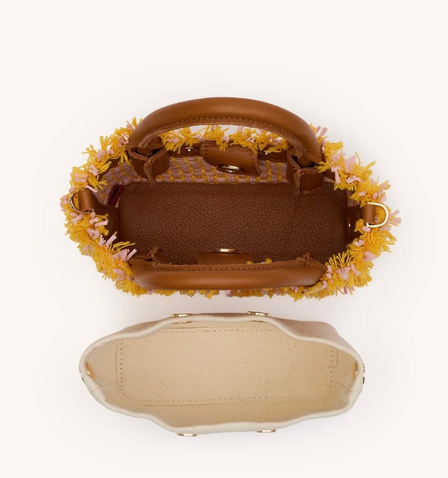 - Crafted with a soft pink and cheery orange Italian weave, paired with a Mosaic Brown smooth, semi-veg tanned leather