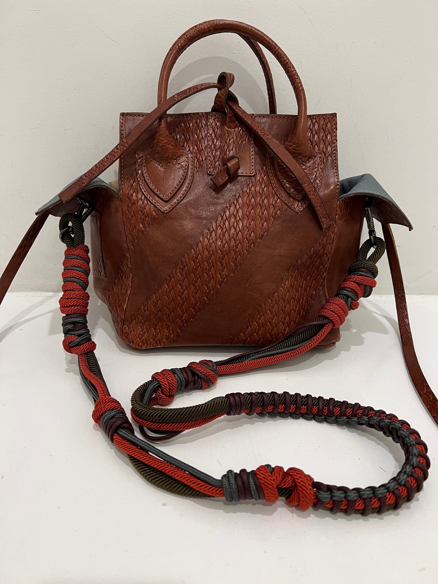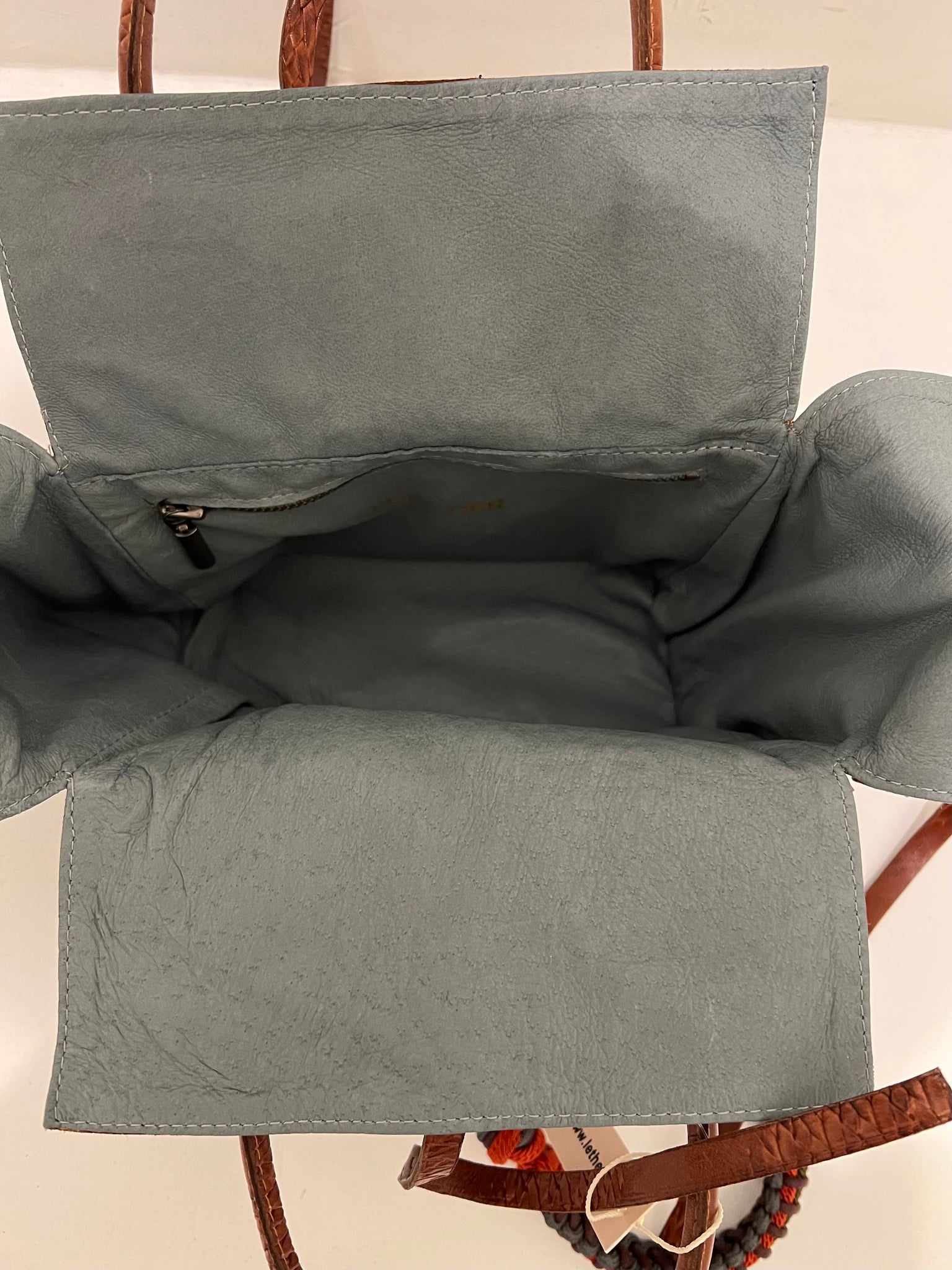 Handmade embossed leather goods from Israel. This beautiful piece has a soft teal suede interior with a large zip pocket. Ties shut with detachable colorful cord strap.