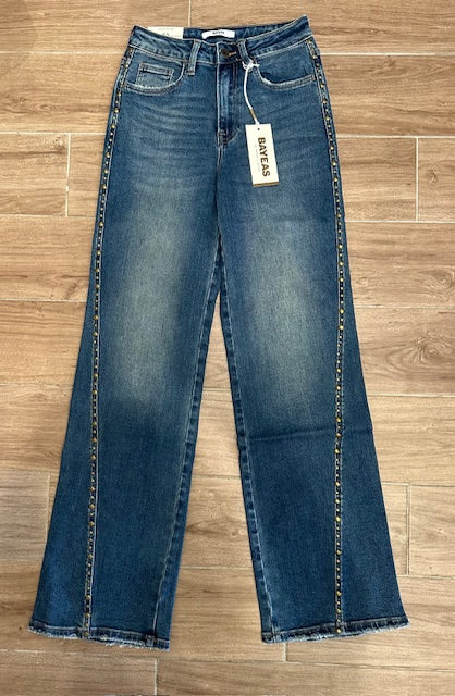 High rise wide leg jeans featured in a vintage feel featured in a comfortable stretch fabrication and 5-pocket styling with studded detailing. LOVE the STUDS! :)