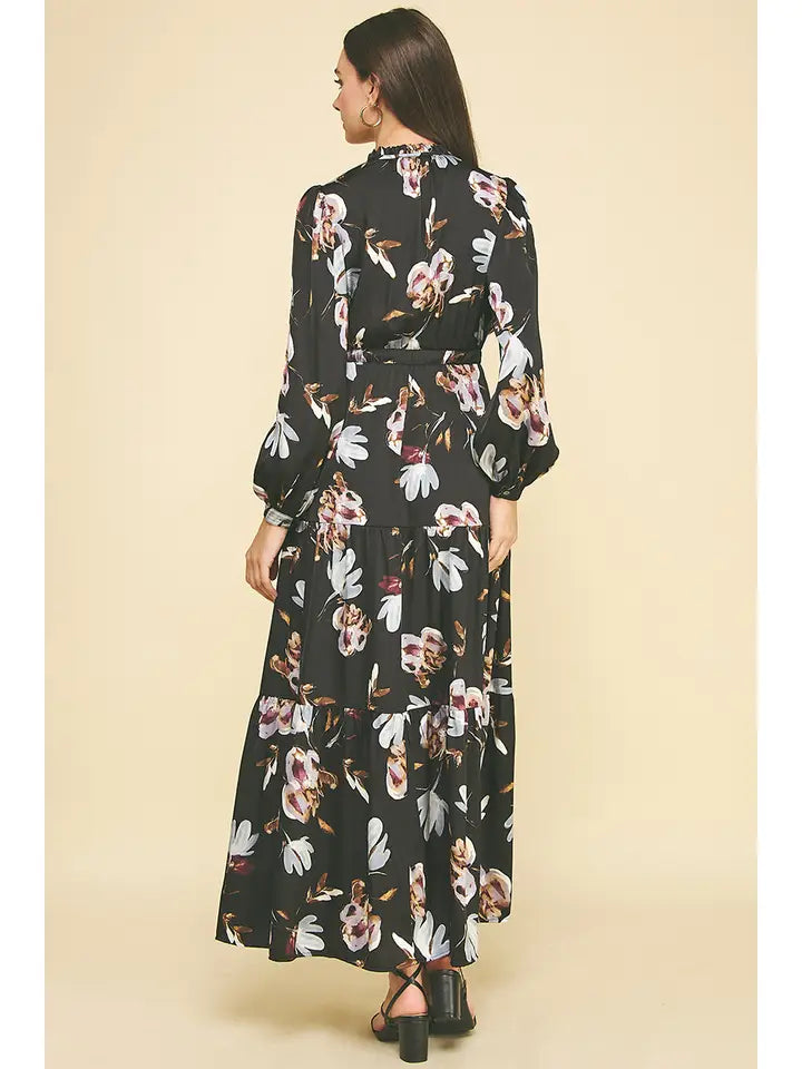 Ruffled mock neck dress with self-tie, tiered detail, self-tie at waist balloon long sleeve and side pockets!