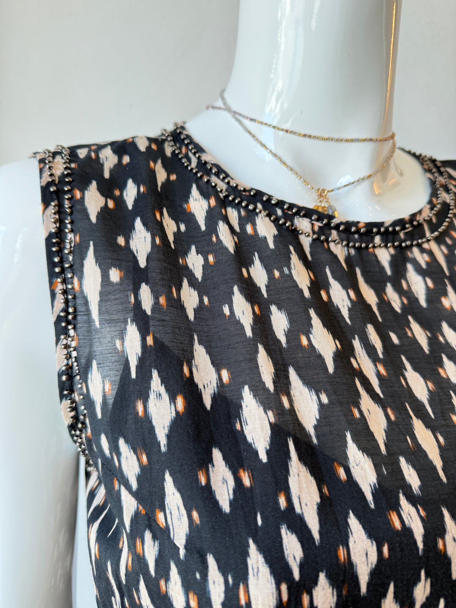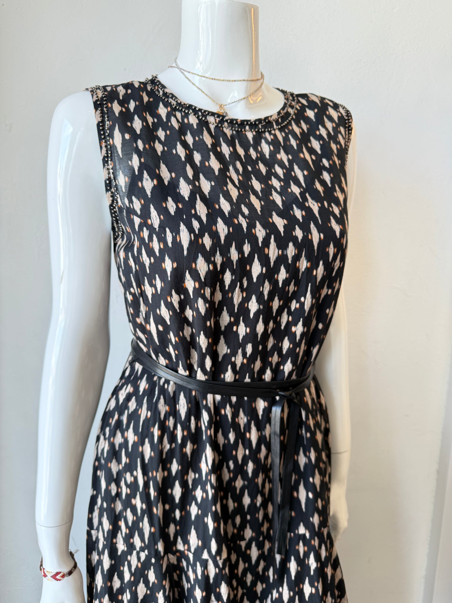 Beautiful drop waist dress with slip features beaded neckline and faux leather wrap belt.