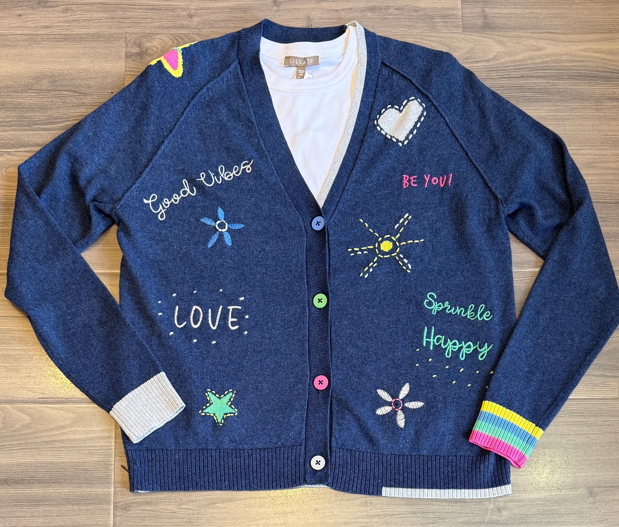Layer up with positivity in this vibrant embroidered cardigan that celebrates good vibes. Featuring uplifting words stitched across a classic heather blue base, it's accented with cheerful colors that brighten any outfit. Perfect for expressing your optimistic spirit while staying cozy and stylish. A wearable reminder that life's better when you're spreading good energy.