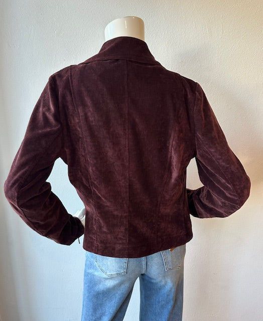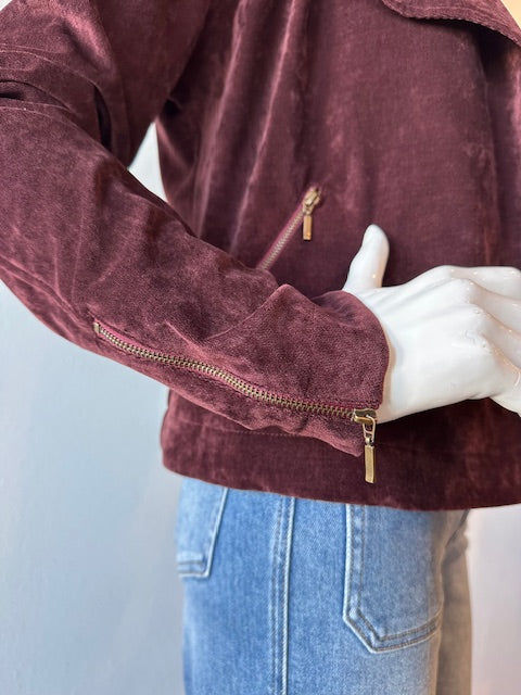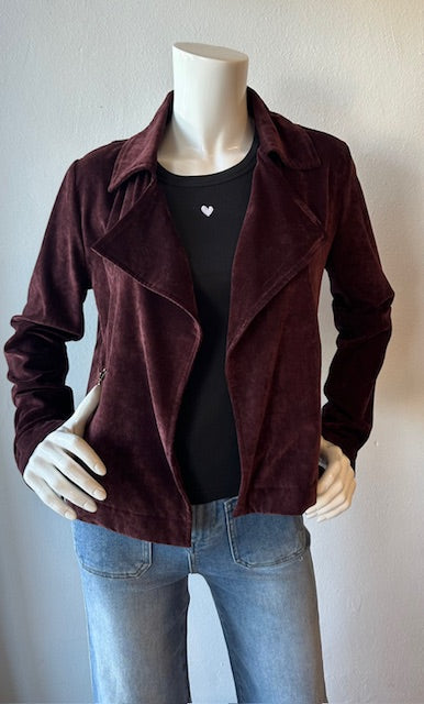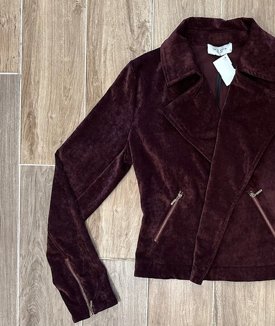 This "moto" style jacket is the perfect lightweight jacket for any occasion! Really cute with denim and can be elevated with a pair of silk trousers or your favorite skirt and biker boots! Open front (no front zipper) with zippered pockets on the angle and a zip at the sleeve.