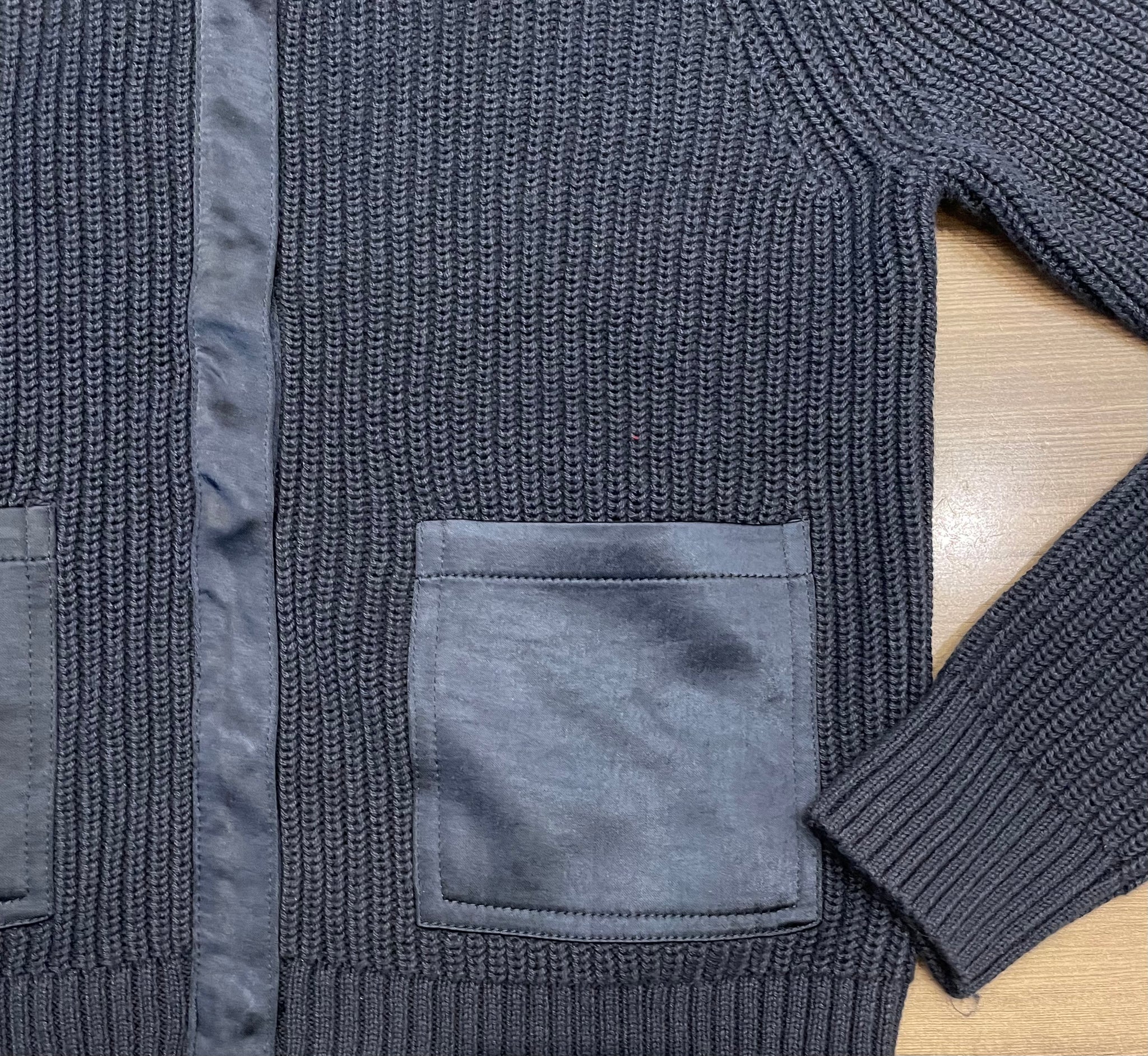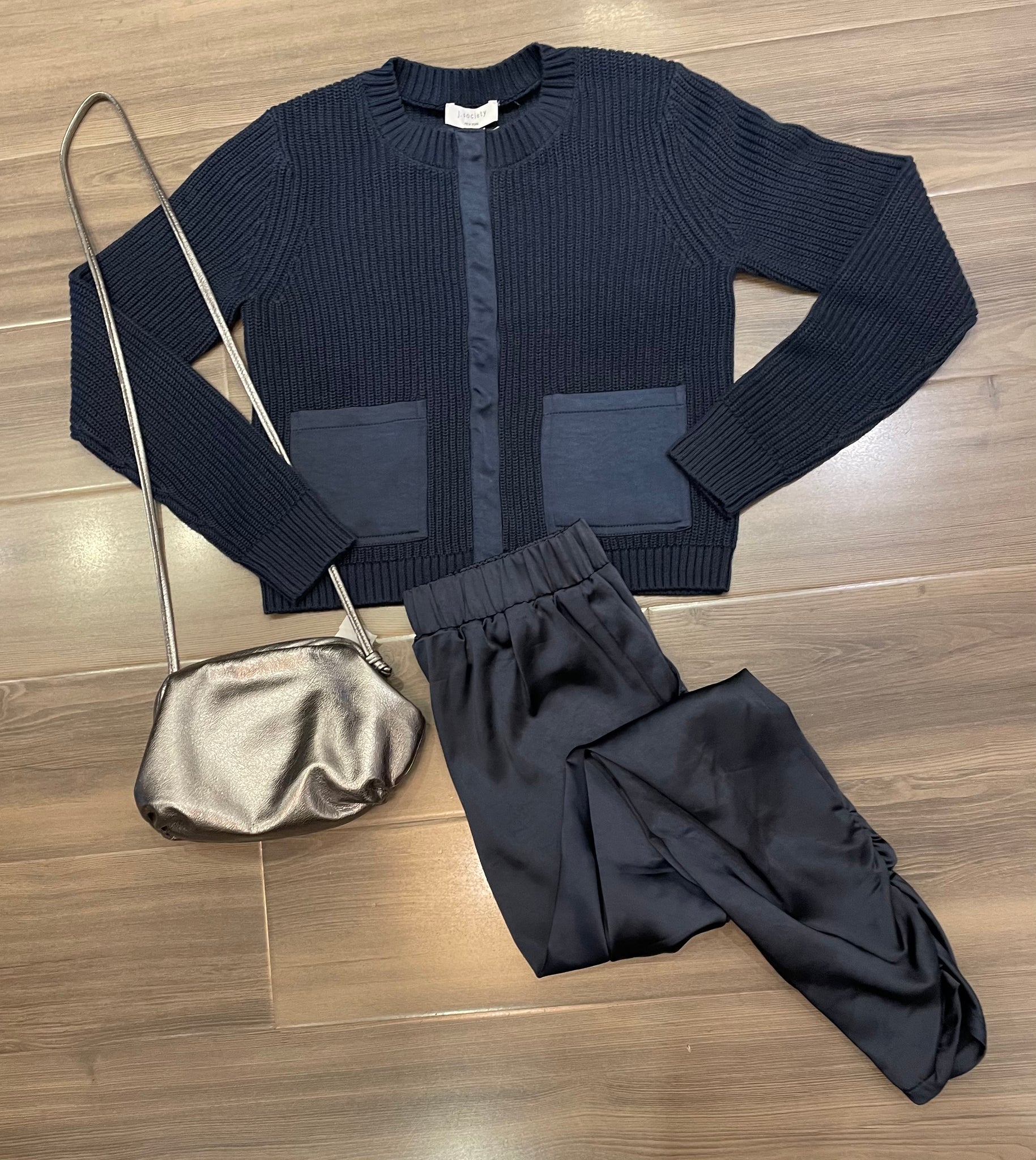 The shaker knit pattern is known for its distinct horizontal ribbing and slightly chunky texture. It’s soft, warm, and structured enough to hold its shape without feeling stiff. The standout detail is the satin pockets—smooth, shiny fabric that contrasts beautifully with the matte, textured knit. The patch pockets sewn on the front add a subtle touch of luxury. The satin adds a refined, slightly dressy element to a cozy piece.