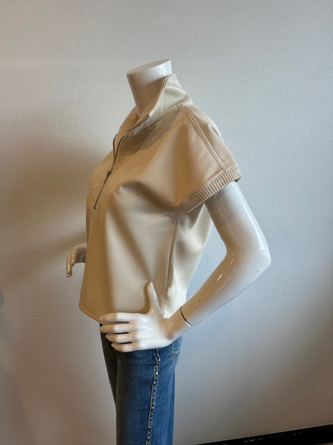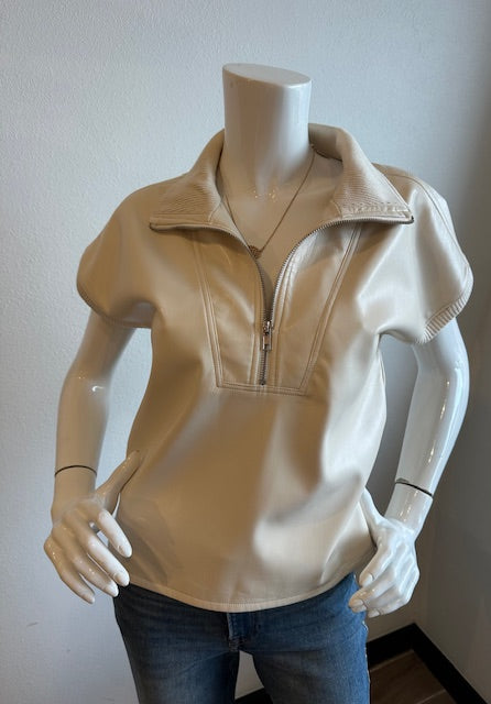 The "It" top of the Season!! This creamy vegan leather top hit's just right for any occasion! Ribbed trim inside the 1/2 zip collar and at arm holes add a level of texture that's unique and modern.