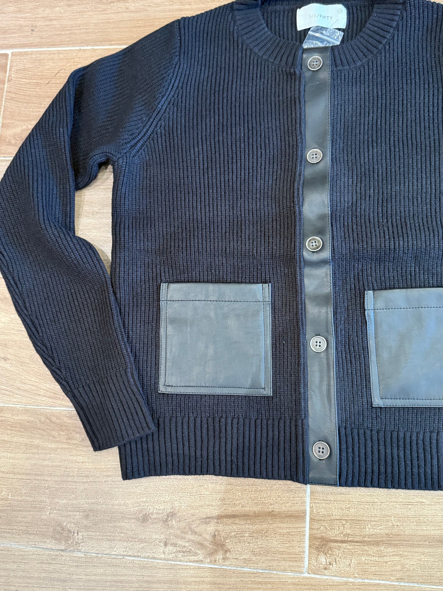 This black cardigan from Six/ Fifty combines classic knit comfort with modern sophistication, featuring faux leather pockets and trim for a sleek, polished look. Designed for versatility, it adds an edgy yet refined touch to any outfit, perfect for layering in cooler weather while maintaining stylish appeal.