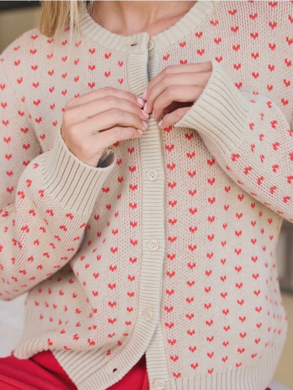 Oh!! This is sweet! Fall for the sweetness of this delightful cardigan, where tiny hearts dance across the oatmeal knit in the most charming way. Layer over anything and instantly elevate your vibe with a touch of heartfelt style. It's the kind of piece that makes getting dressed feel like a little celebration.