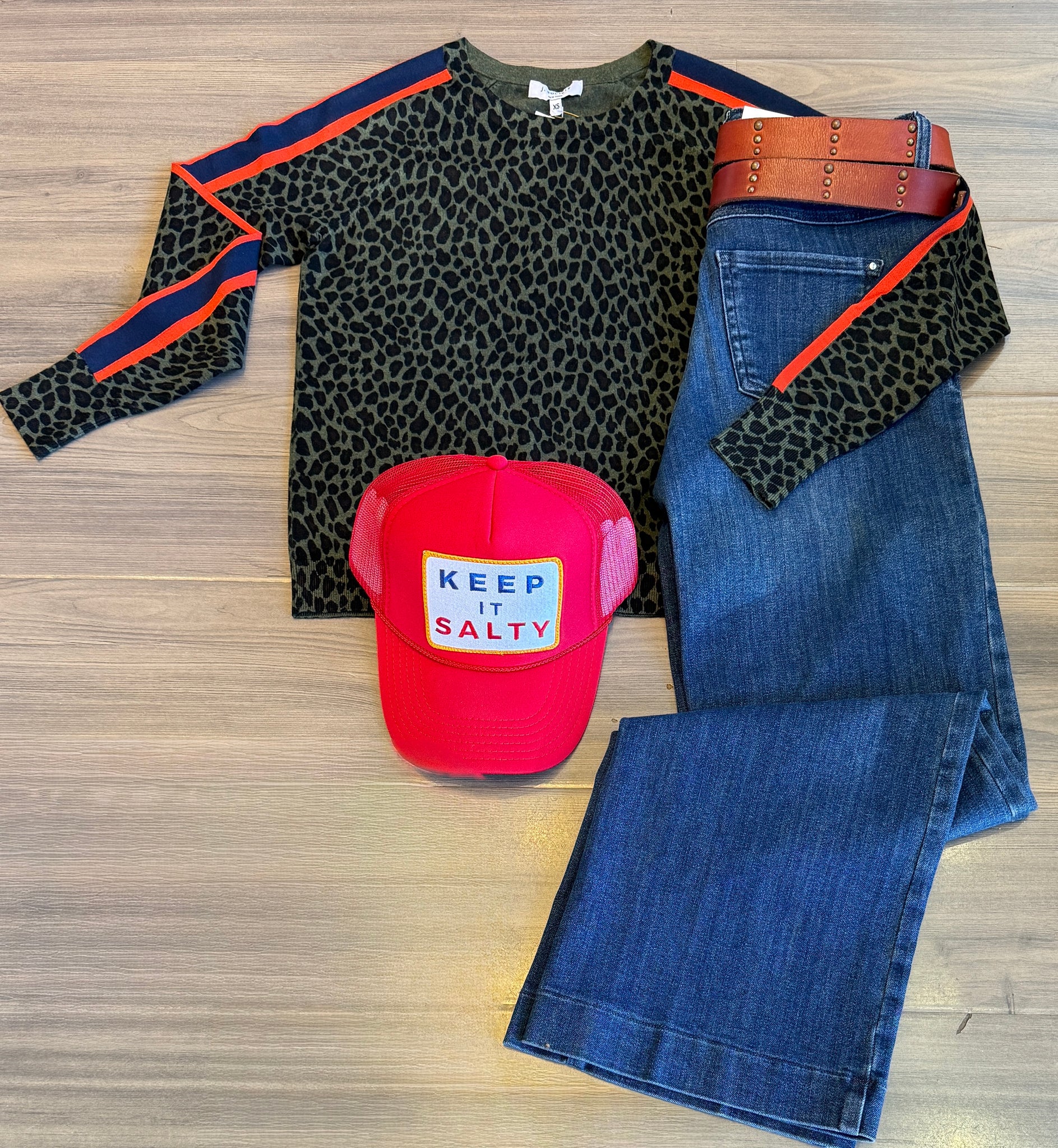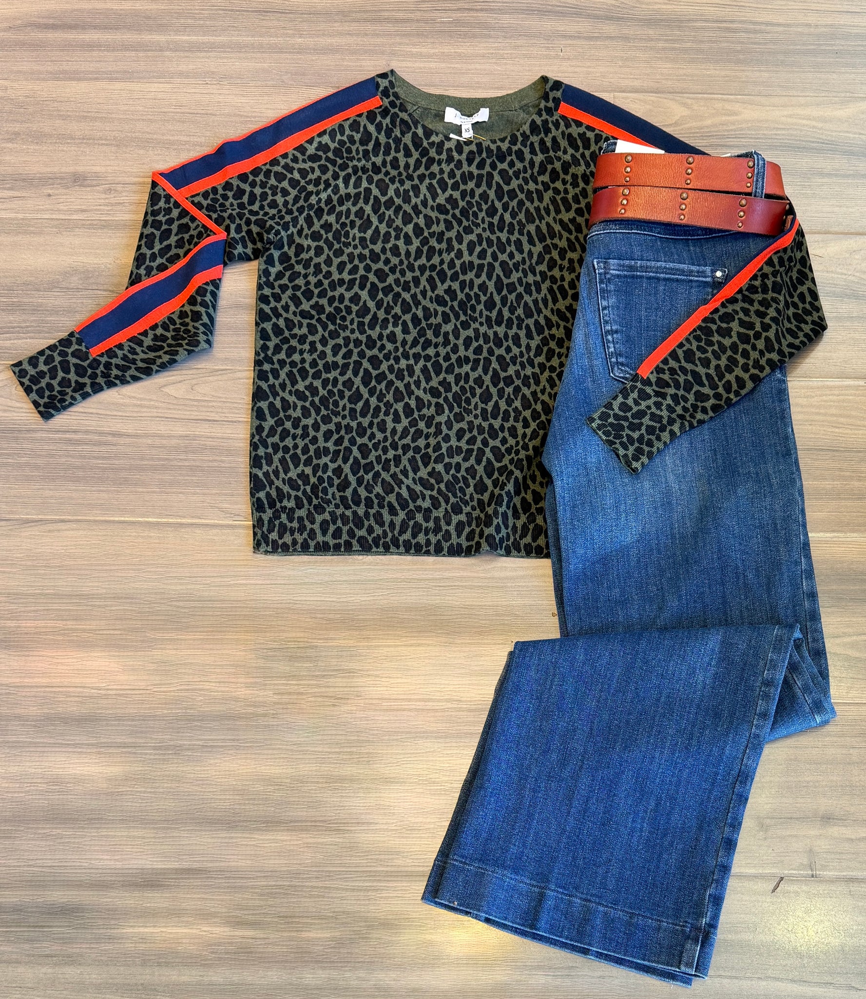This long sleeve leopard-print sweater from J. Society is a playful take on a wardrobe classic. The neutral beige base allows the small bold pattern to shine while the red and navy stripe make it pop in all the right ways!