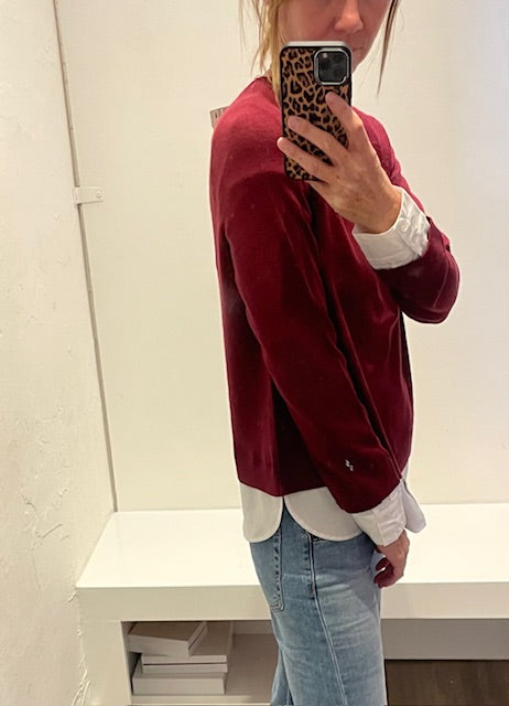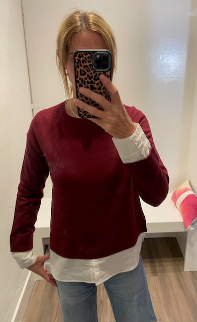 The look of layers- but without the layers!! Embrace your inner preppy with this awesome twofer. The crisp white cotton really pops against this bordeaux (burgundy) sweater.