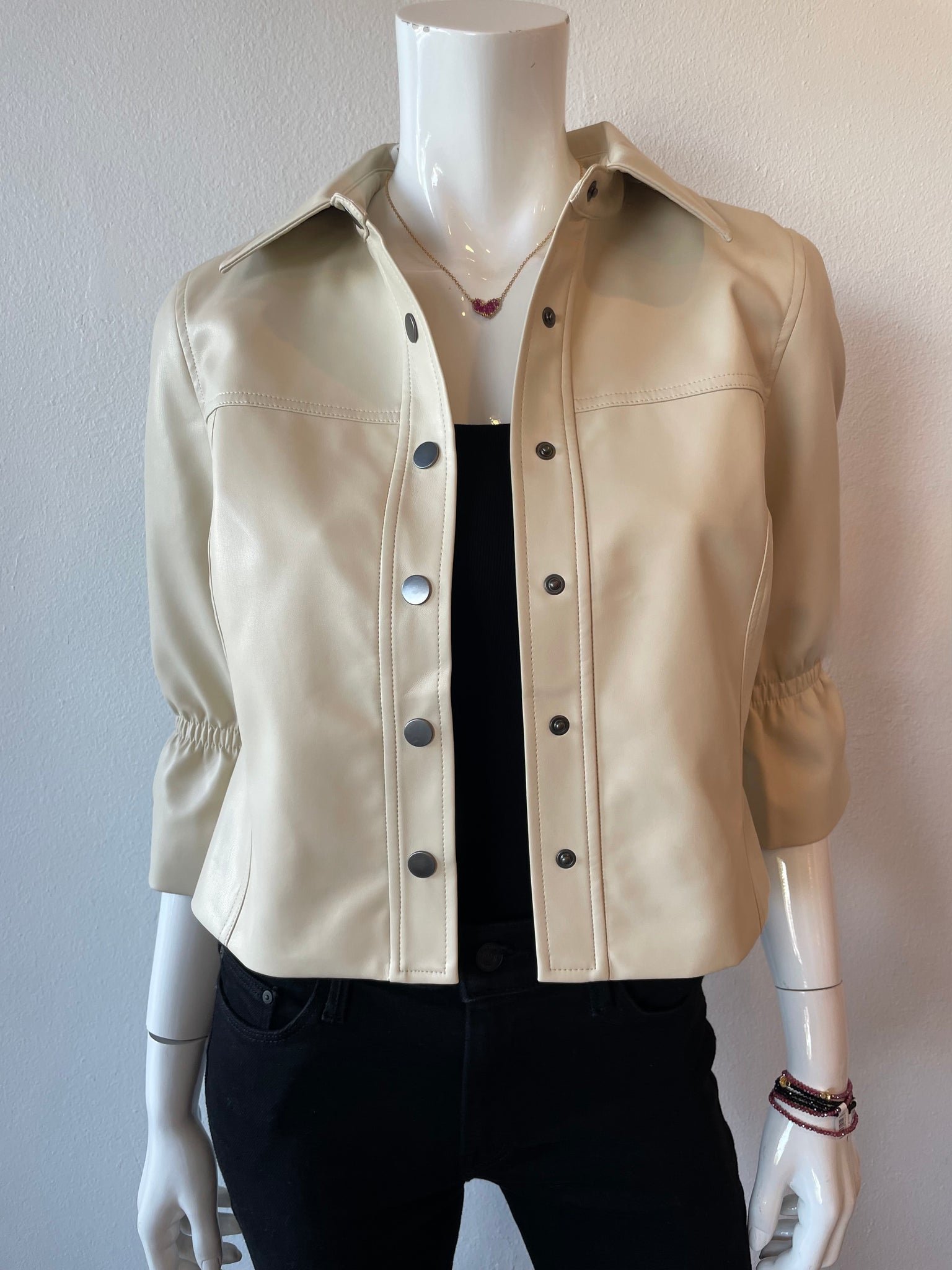 Bring the drama with this vegan leather jacket that refuses to blend in. The flair sleeves are pure fashion magic, giving you instant presence and undeniable style. The snap button closure keeps things breezy and effortless, while the sustainable material means you're looking good without the guilt trip. Your wardrobe just got a serious upgrade.