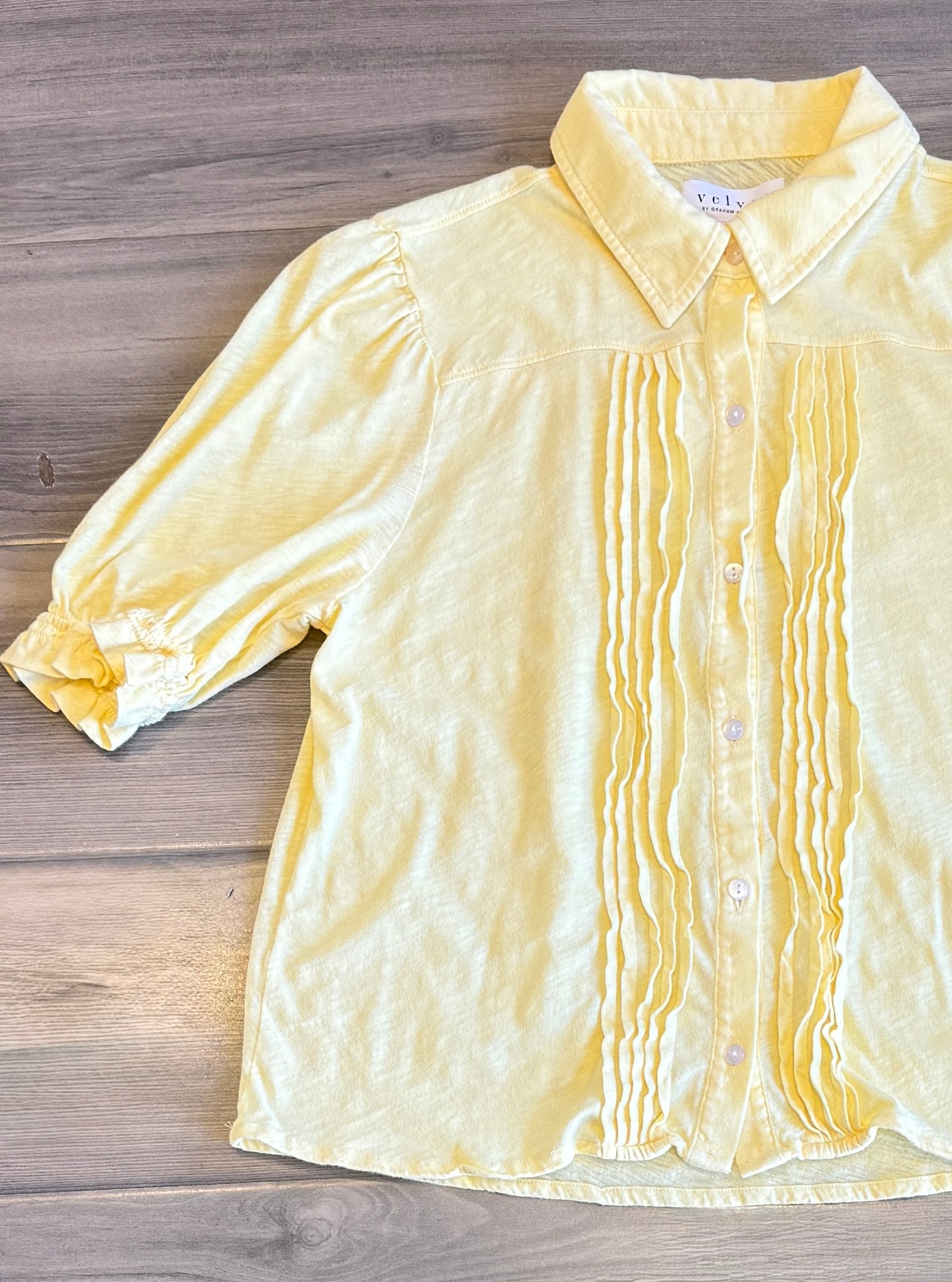 Crafted from soft cotton slub, this tee elevates a classic silhouette with refined style. It features a full button front and classic collar for timeless structure, with pleated detailing down the front adding subtle texture. The back is softly ruched, and slightly puffed sleeves with ruffle elastic cuffs bring a feminine, elevated touch.