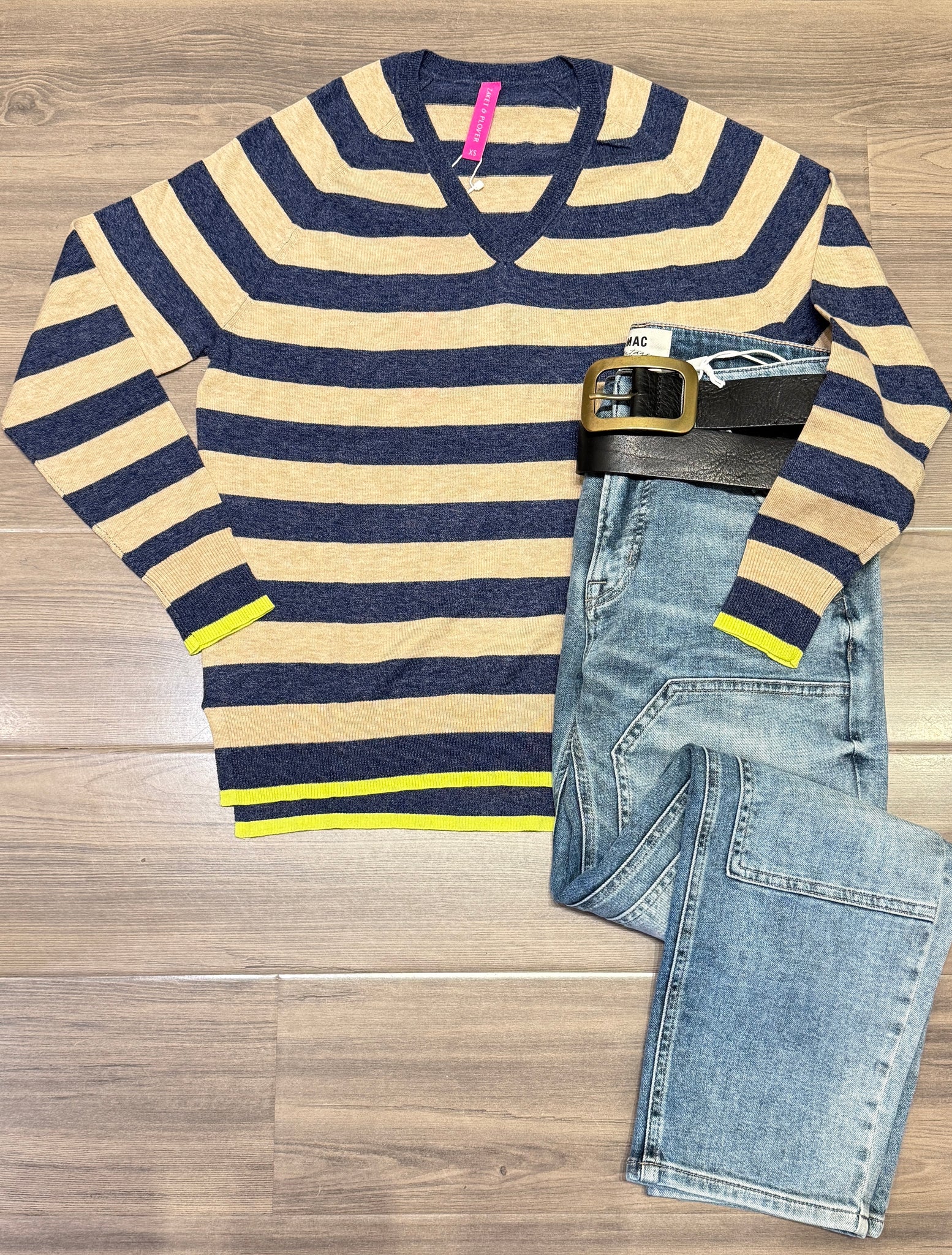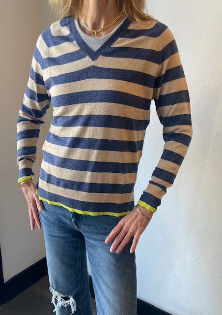 Zaket and Plover's Stripe Vee Top is a fabulous must-have in women's knitwear. This long sleeve top features a playful stripe pattern, with contrasting color on the hemline and sleeves. Ideal for the changing seasons, this sweater has a relaxed fit and a chic vee neck. The blend of 95% cotton and 5% cashmere means it is breathable and so soft. Easy to wear and to style, this women's top is perfect paired with jeans, for a fun outfit.