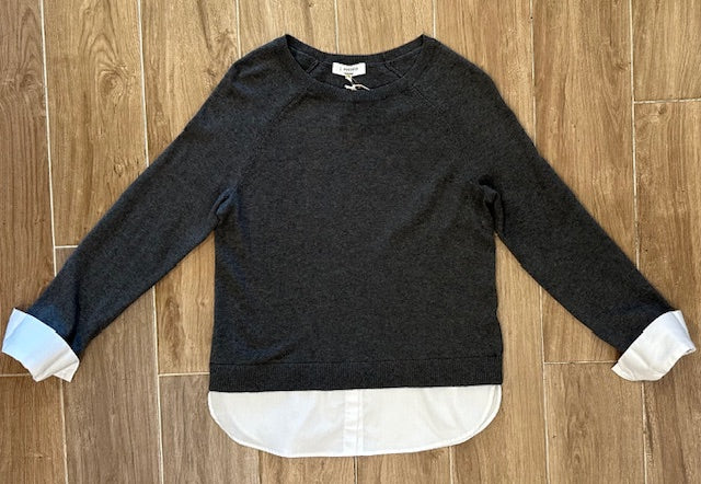 The look of layers- but without the layers!! Embrace your inner preppy with this awesome twofer. The crisp white cotton really pops against this medium grey sweater.