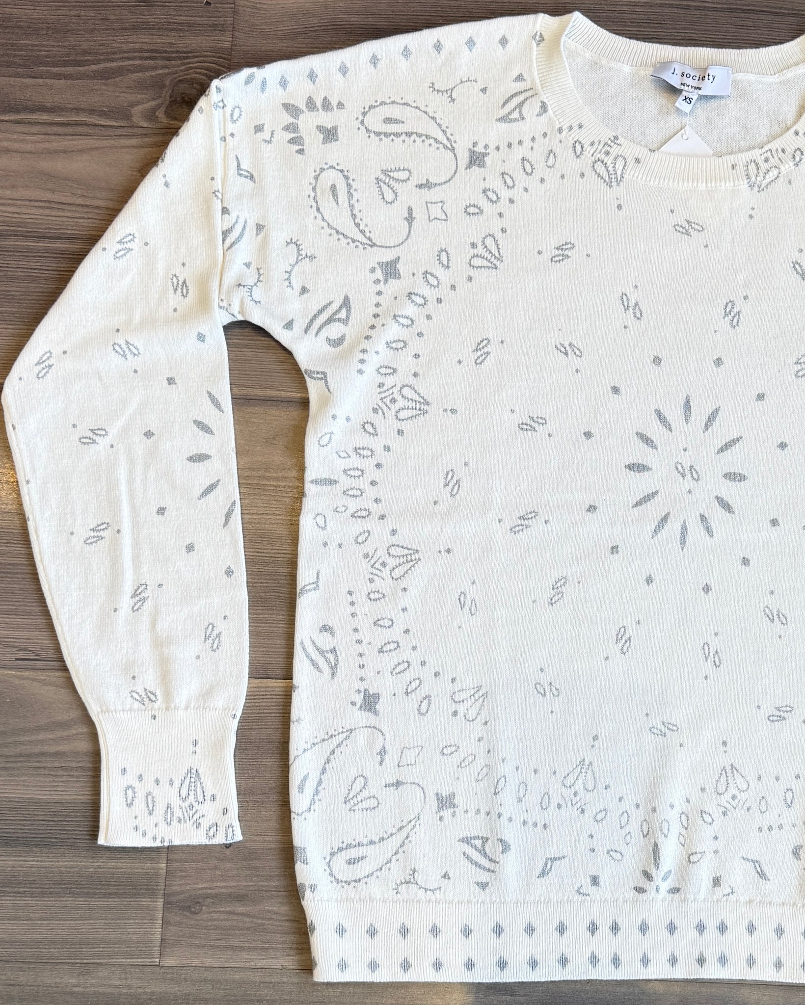 The J Society foil bandana sweater is a stylish and eye-catching piece that combines casual comfort with bold, metallic flair. This sweater features a bandana-inspired print— paisley motifs, intricate borders, and vintage Western patterns—accented with a foil finish that gives it a sleek, reflective sheen.