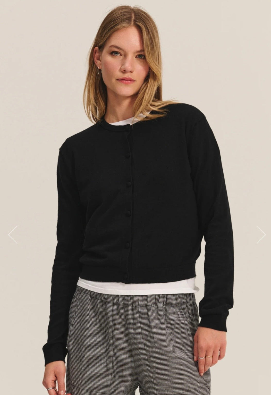 The classic black cardigan in the softest cotton/cashmere blend features covered button detail. Wear layered over a dress or tee or wear fully buttoned as a top. Either way - you can't beat a classic like this!