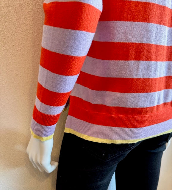 Brighten your days in this whimsical V-neck sweater that celebrates color and pattern. Cheerful stripes with contrasting trim adds a cheeky finishing touch at the waistline & sleeves. The flattering V-cut is endlessly versatile-dress it up with tailored trousers or keep it casual with your favorite jeans. This sweater brings joy to every outfit. Pure fun, pure comfort, pure you.